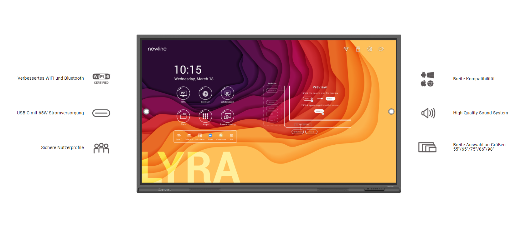 Das LYRA Touch Display ist ein 65 Zoll Touchdisplay für interaktive Meetings, Konferenzen oder Besprechungen. Das LYRA Touch Display verfügt über ein hochwertiges Touchscreen mit 20 Multi-Touch Punkten, Auflösung in 4K und 11.0-Basis Android-Betriebssystem.