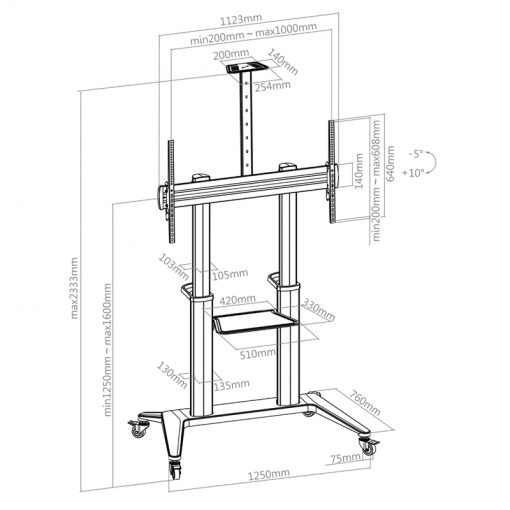 Elektrisch höhenverstellbares Fahrgestell für SMART BoardDas Fahrgestell eignet sich insbesondere für Organisationen, die ein fixiertes SMART Board / interaktives Whiteboard benötigen beispielsweise in Schulen oder Unternehmen. Jetzt Standfuß im Bundle mit einem interaktiven Whiteboard im Shop bestellen und sparen!   Technische Daten: Unterstützte Bildschirm-Formate: 65 - 120 Zoll Montage: Landscape-Ausrichtung VESA-Aufnahme -5° / +10° neigbar Elektro-motorische Höhenverstellung 140 kg max. Traglast kabelgebundene Tastbedienung Lenkrollen mit Feststellbremse montageseitig höhenverstellbar bis zu 233.3 cm (mittig des Bildschirms) empfohlene Verwendung : Flachbildschirm / AV-System / Kamera empfohlene Display-Größe : 165-305 cm (65"-120") maximales Ladegewicht : 140 kg 4 Bodenausgleichsfüße inkl. Kameraaufnahme und AV-Ablage innenliegende Kabelführung  Jetzt beraten lassen