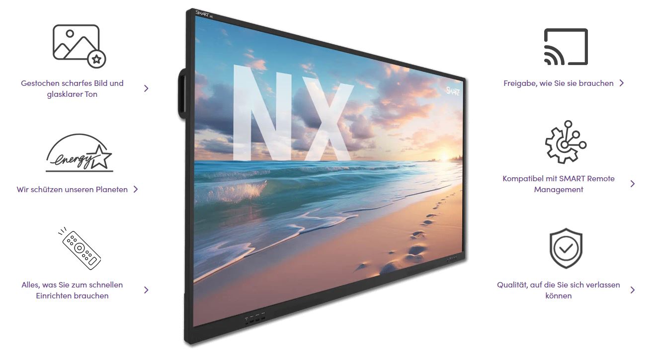 Das SMART Board NX165 (65 Zoll) aus der NX-Serie bietet Ihrem Unternehmen eine leistungsstarke, nicht-interaktive Displaylösung für Meetings, Präsentationen und Videokonferenzen. Mit gestochen scharfem 4K-Bild und beeindruckendem 40-W-Sound holen Sie das Maximum aus Ihren Besprechungen heraus – ob im Büro oder remote.