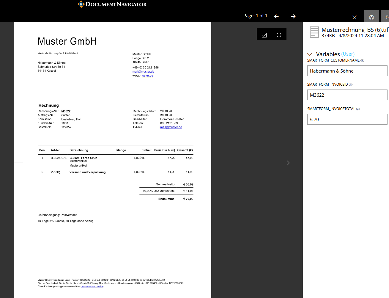 Der Document Navigator ermöglicht die einfache und zuverlässige Durchführung alltäglicher dokumentenbasierter Vorgänge. Durch einen einzigen Klick werden automatisch benötigte Informationen wie die Rechnungsnummer, der Rechnungssteller oder das Rechnungsdatum ausgelesen und der Dokumenteninhalt intelligent verarbeitet.