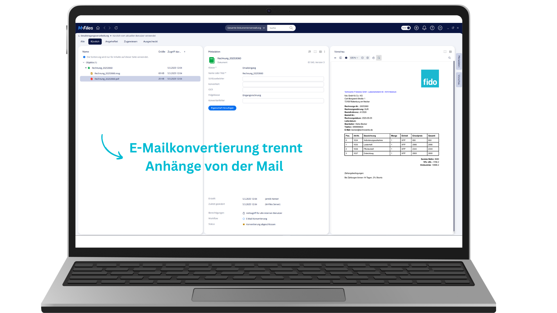 Besonders leistungsfähig wird die Lösung durch die intelligente Dokumentenerkennung: Die Software erkennt automatisch, worum es sich bei einem Anhang handelt – ohne dass manuell sortiert oder verschoben werden muss.