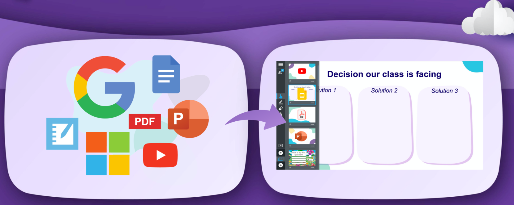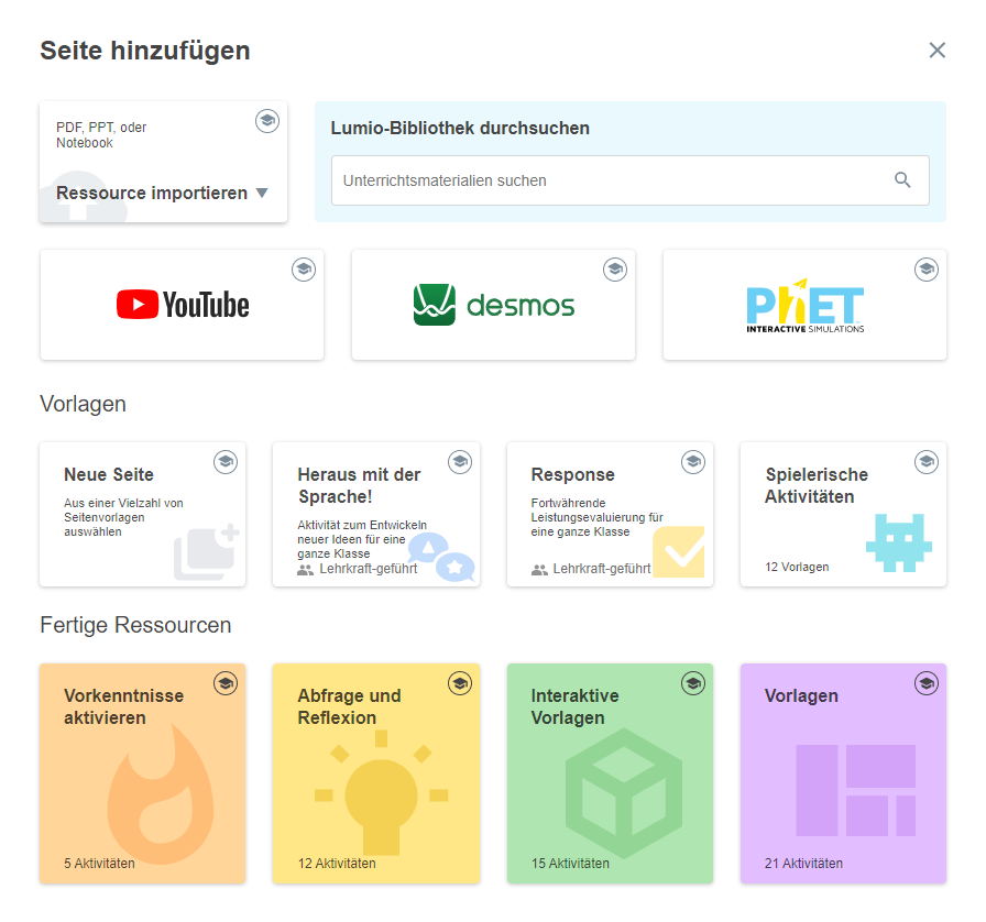 Mithilfe des Lernprogramms ist es möglich die bereits hochgeladenen Ressourcen mit Spielen, Quizze, Gruppenarbeiten und vielem mehr zu ergänzen. Dabei können Schüler*innen mit den Materialien digital interagieren, welche anschließend an der digitalen Tafel angezeigt werden können.