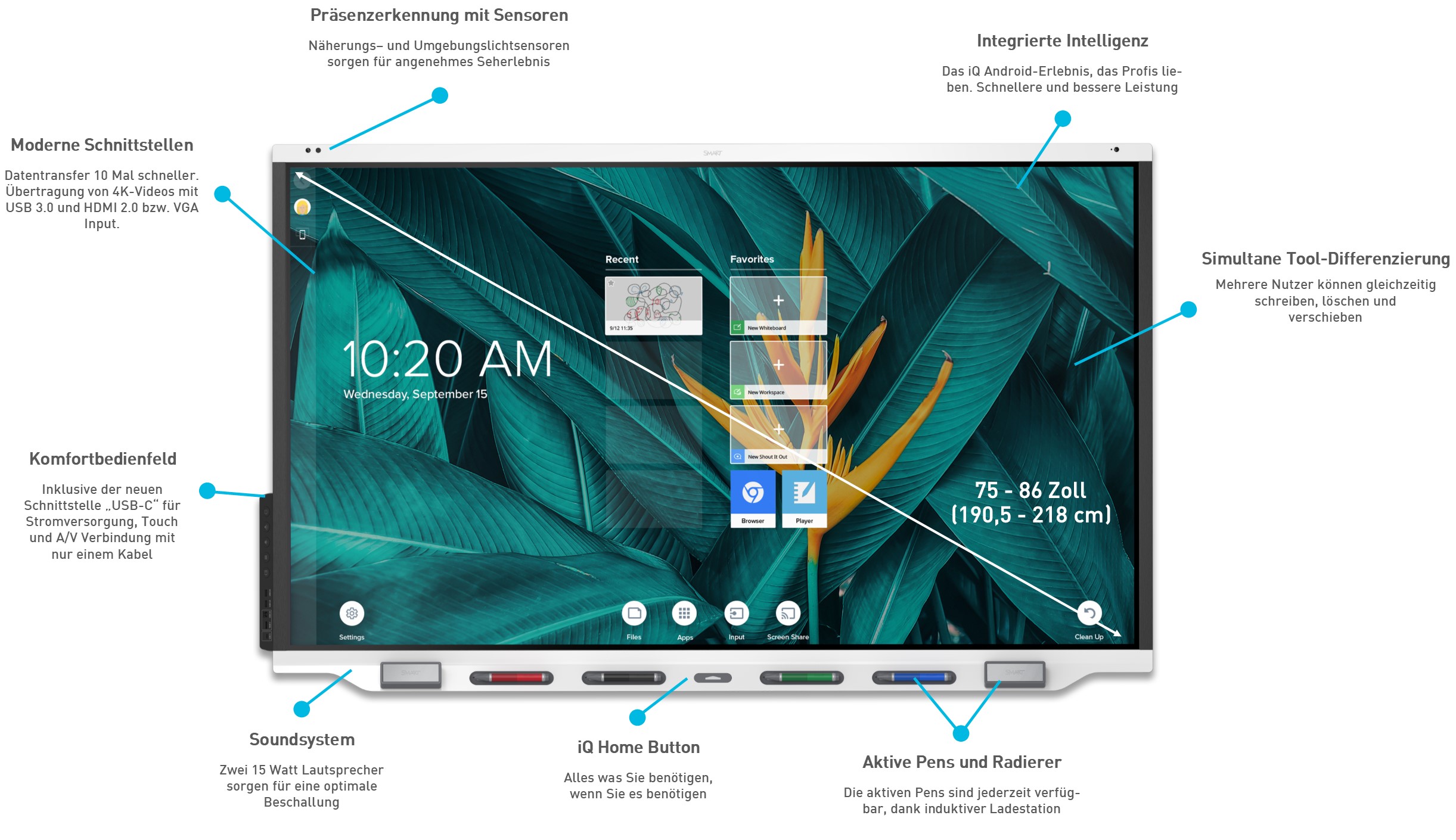 - Optionasmöglichkeiten und Softwarelösungen wie SMART Notebook oder SMART Learning Suite